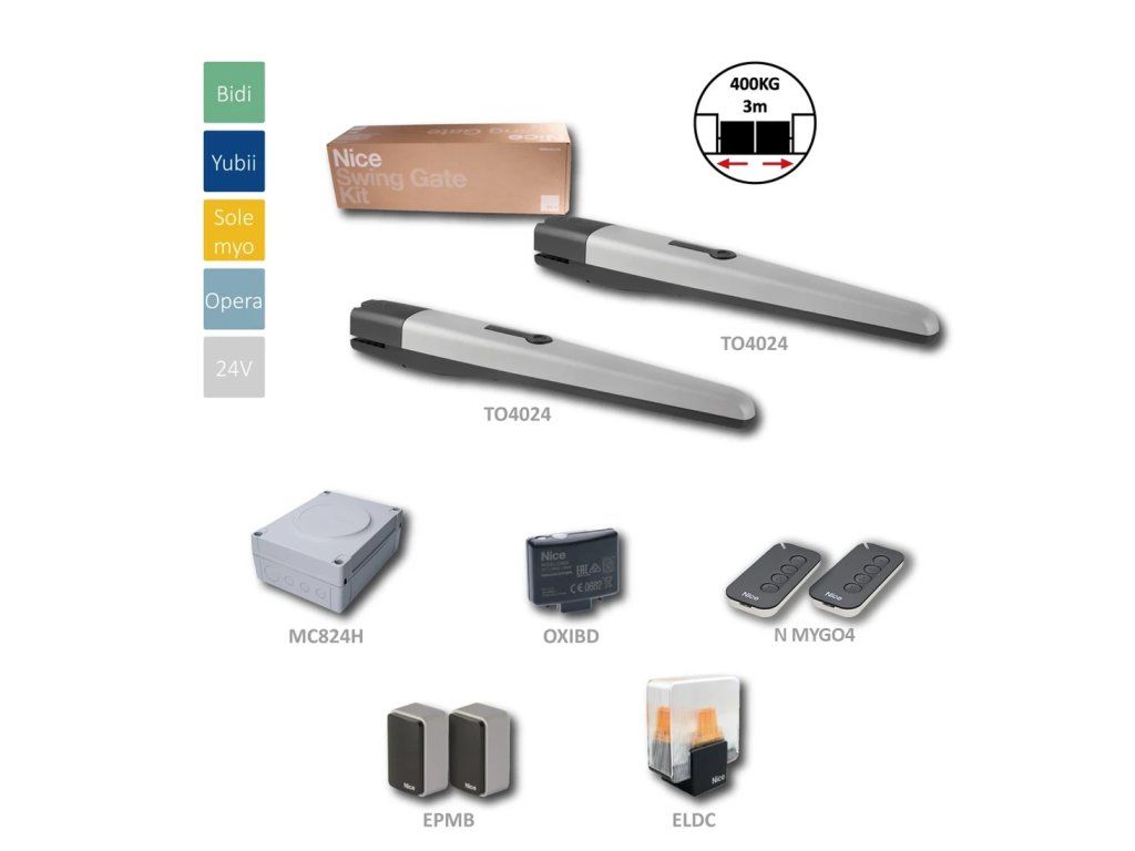 Sada Nice TO4024BDKCE je určena pro automatizaci dvoukřídlých bran s maximální délkou jednoho křídla až 3 metry. Díky promyšlené konstrukci je vhodná i pro brány s většími sloupky nebo lehčí konstrukce křídel, kde běžné pohony nemusí vyhovovat.